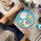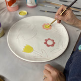 This class is appropriate for ages 12 to adult. Food safe glazes, paintbrushes, and a 12" Charger will be provided, with Rebecca Wood's design pre-etched for you. You'll get to paint in the color (and add embellishments) however you wish! Platters will be kiln-fired after the workshop and will be available for pickup at the studio in the following days.