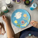 This class is appropriate for ages 12 to adult. Food safe glazes, paintbrushes, and a 12" Charger will be provided, with Rebecca Wood's design pre-etched for you. You'll get to paint in the color (and add embellishments) however you wish! Platters will be kiln-fired after the workshop and will be available for pickup at the studio in the following days.